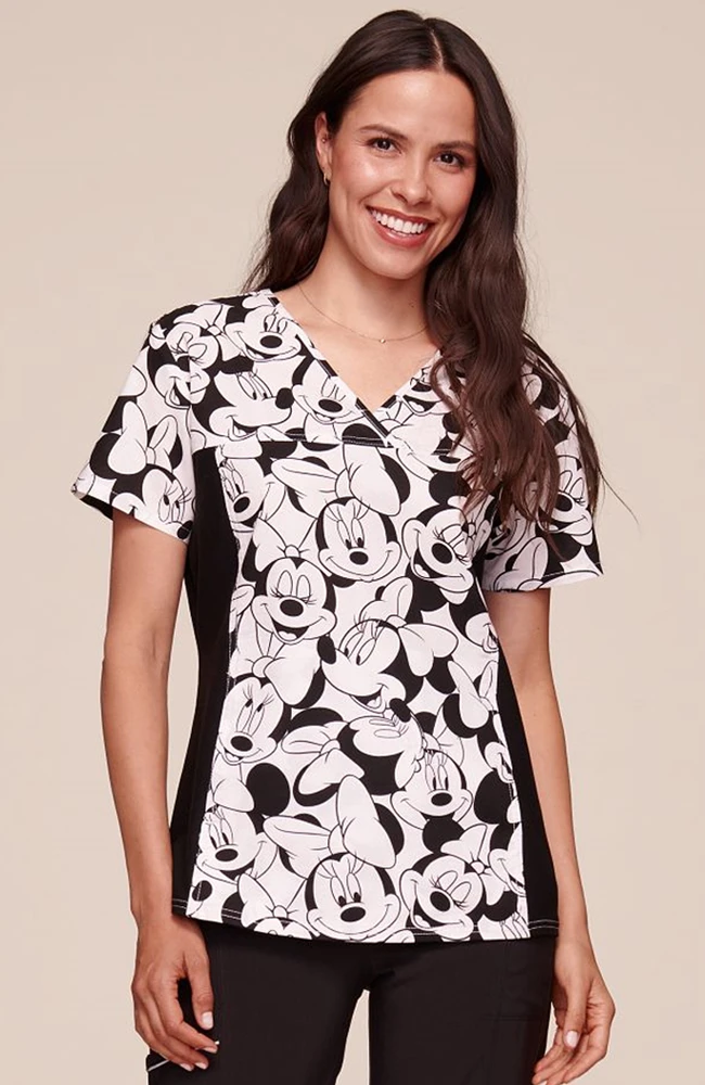 Minnie Mouse makes this scrub top from Cherokee Flexibles extra fun. It has contrast knit side panels that shape and slim the body. It has a V-neckline, front and back yoke and 2 hidden pockets. The fabric is made of 100% cotton.