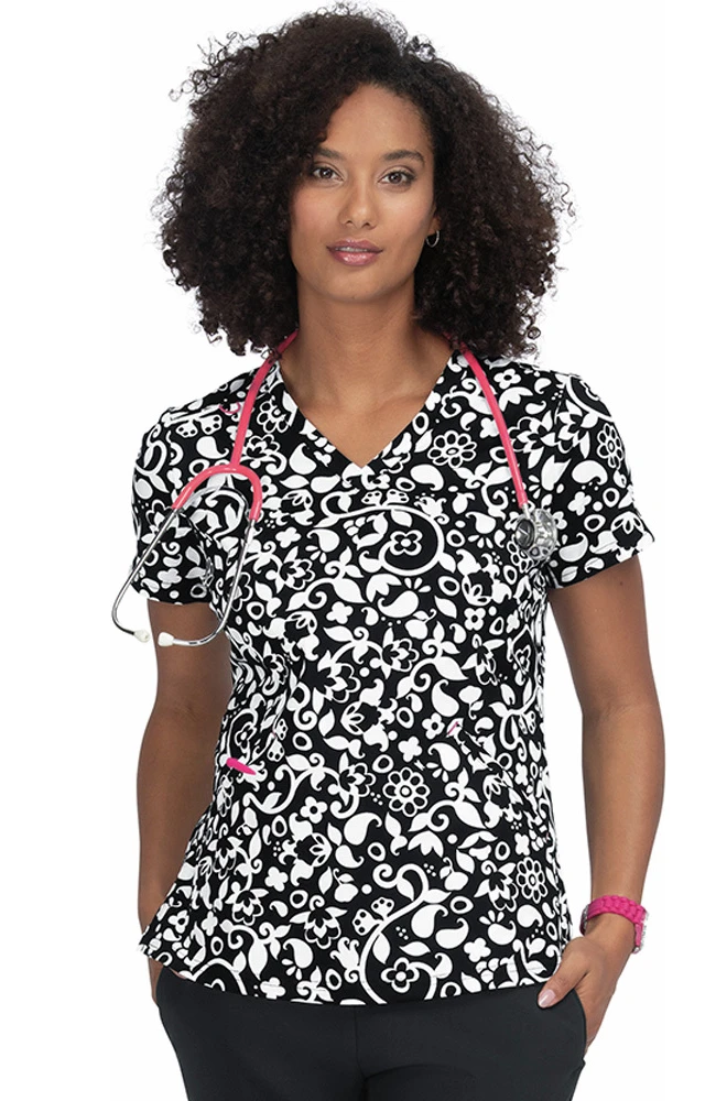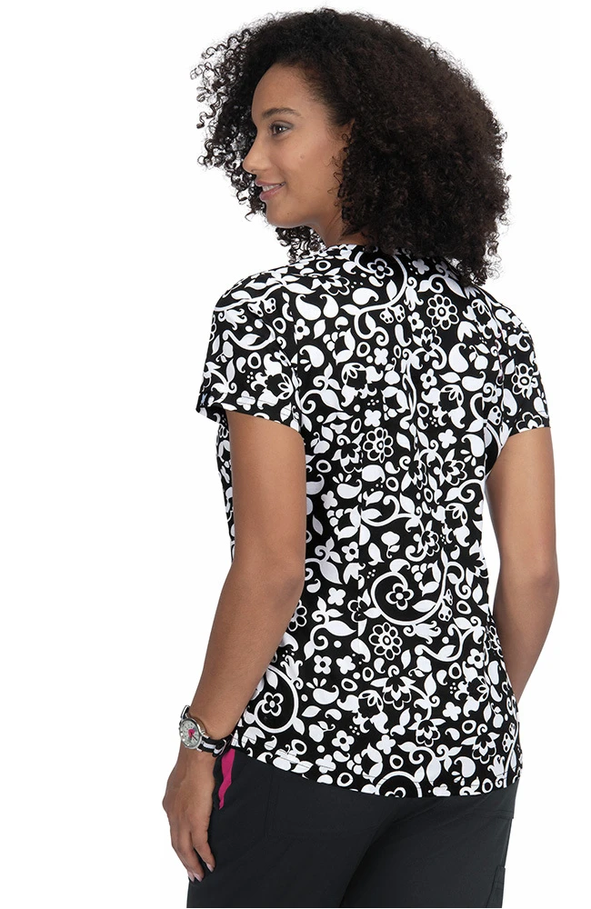 Get a modern monochrome look in the French Bull by koi Women’s Doll Vine Print Scrub Top. The high-contrast black and white floral design makes a stylish statement on this soft and comfortable scrub top.