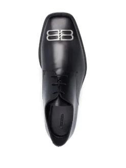 logo-plaque leather Derby shoes from BALENCIAGA featuring black, calf leather, silver-tone logo plaque, square toe, front lace-up fastening, branded leather insole and low stacked heel.