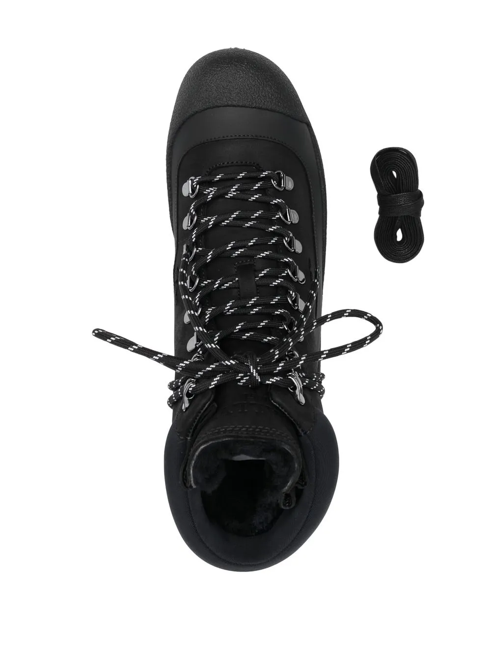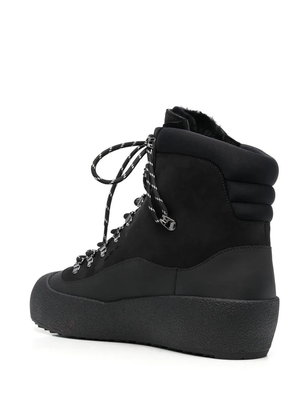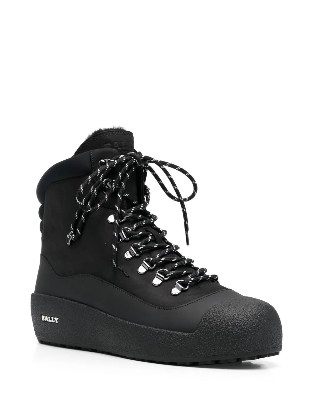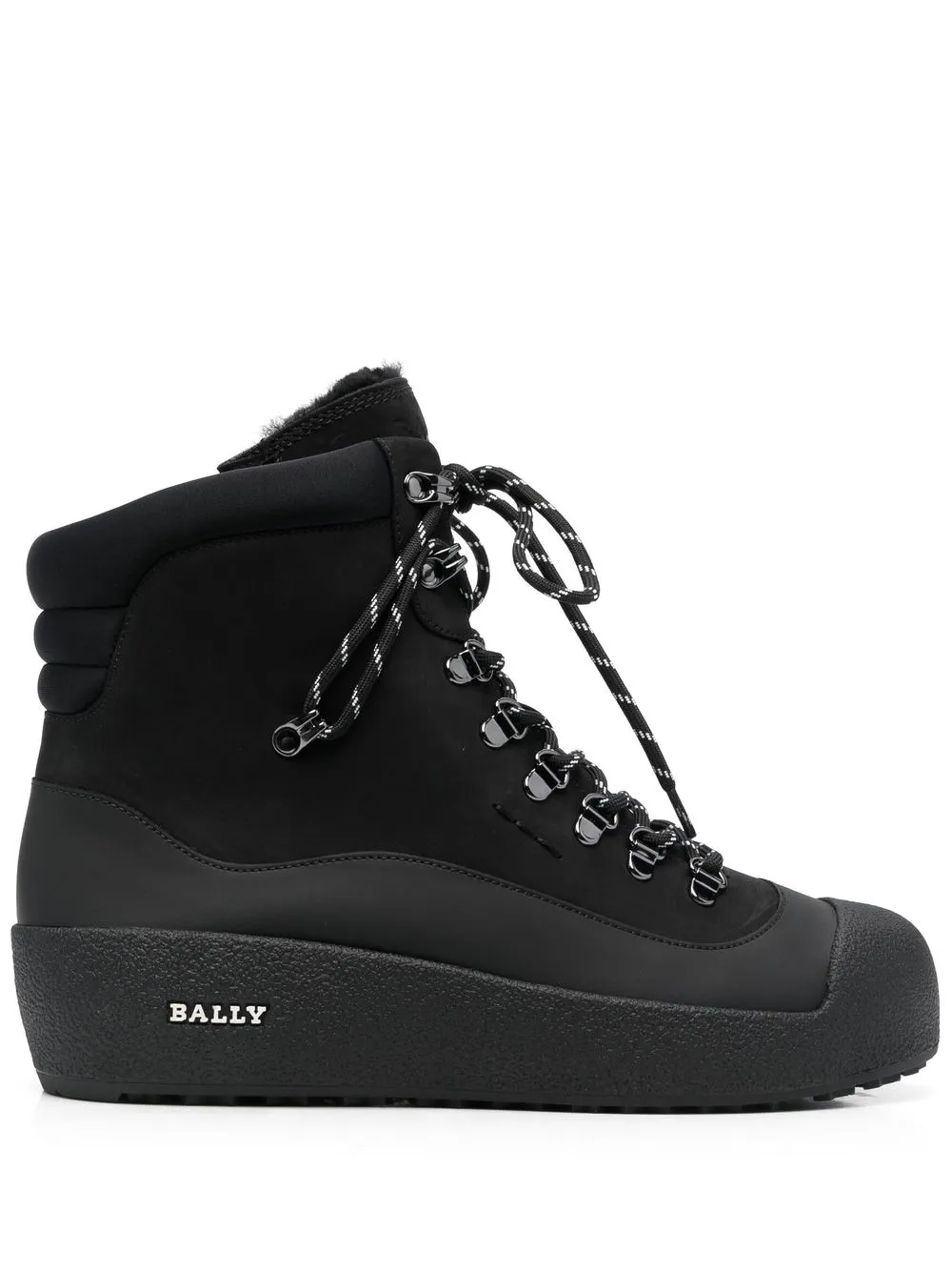 Cayden Curling boots from BALLY featuring black, calf leather, ankle-length, silver-tone logo lettering, tonal stitching, panelled design, round toe, front lace-up fastening and flatform sole.