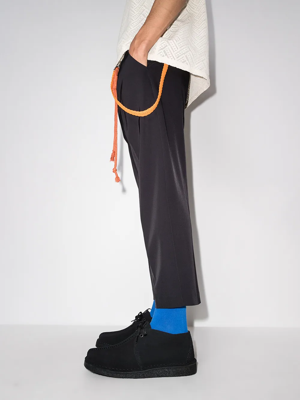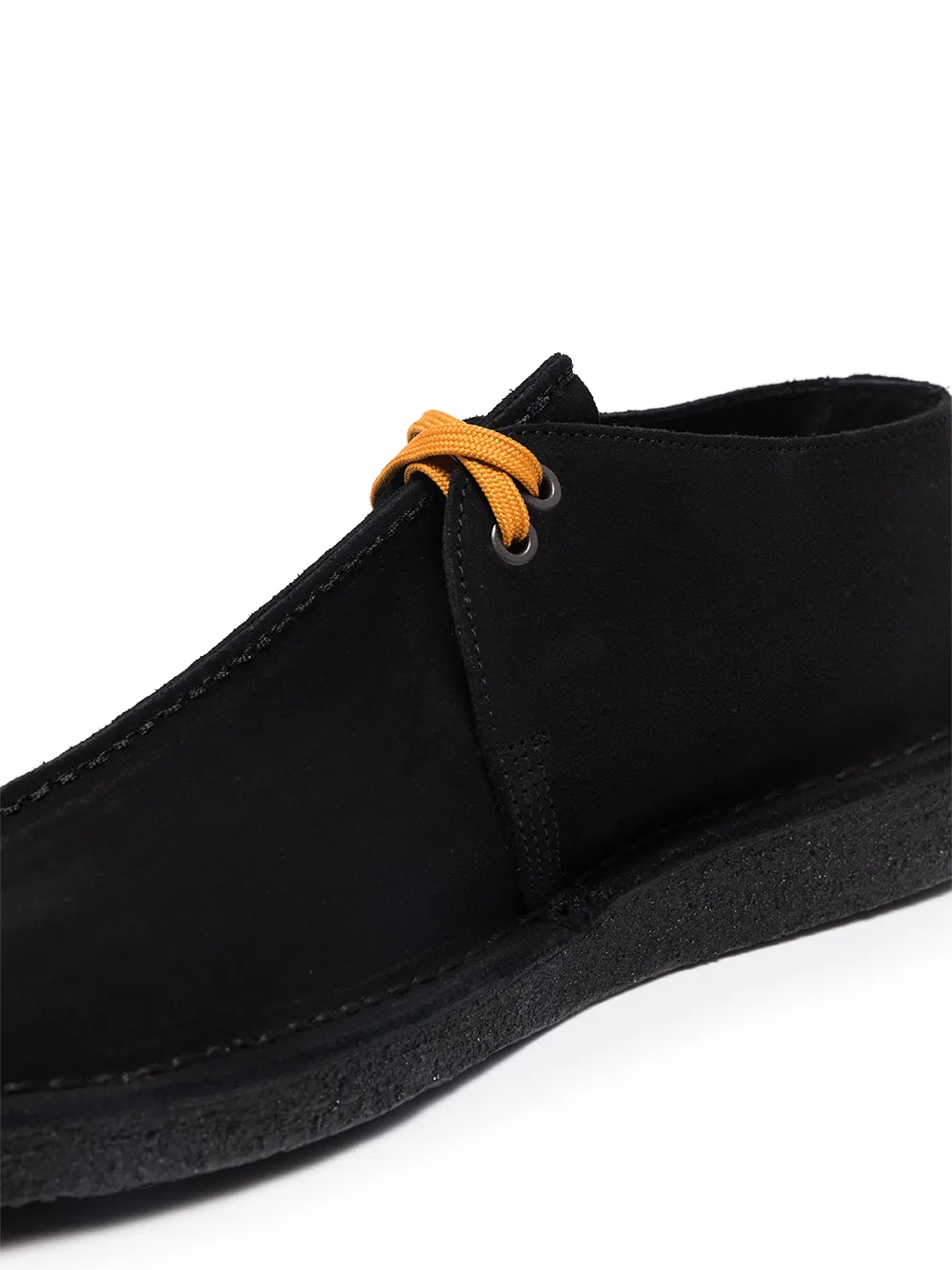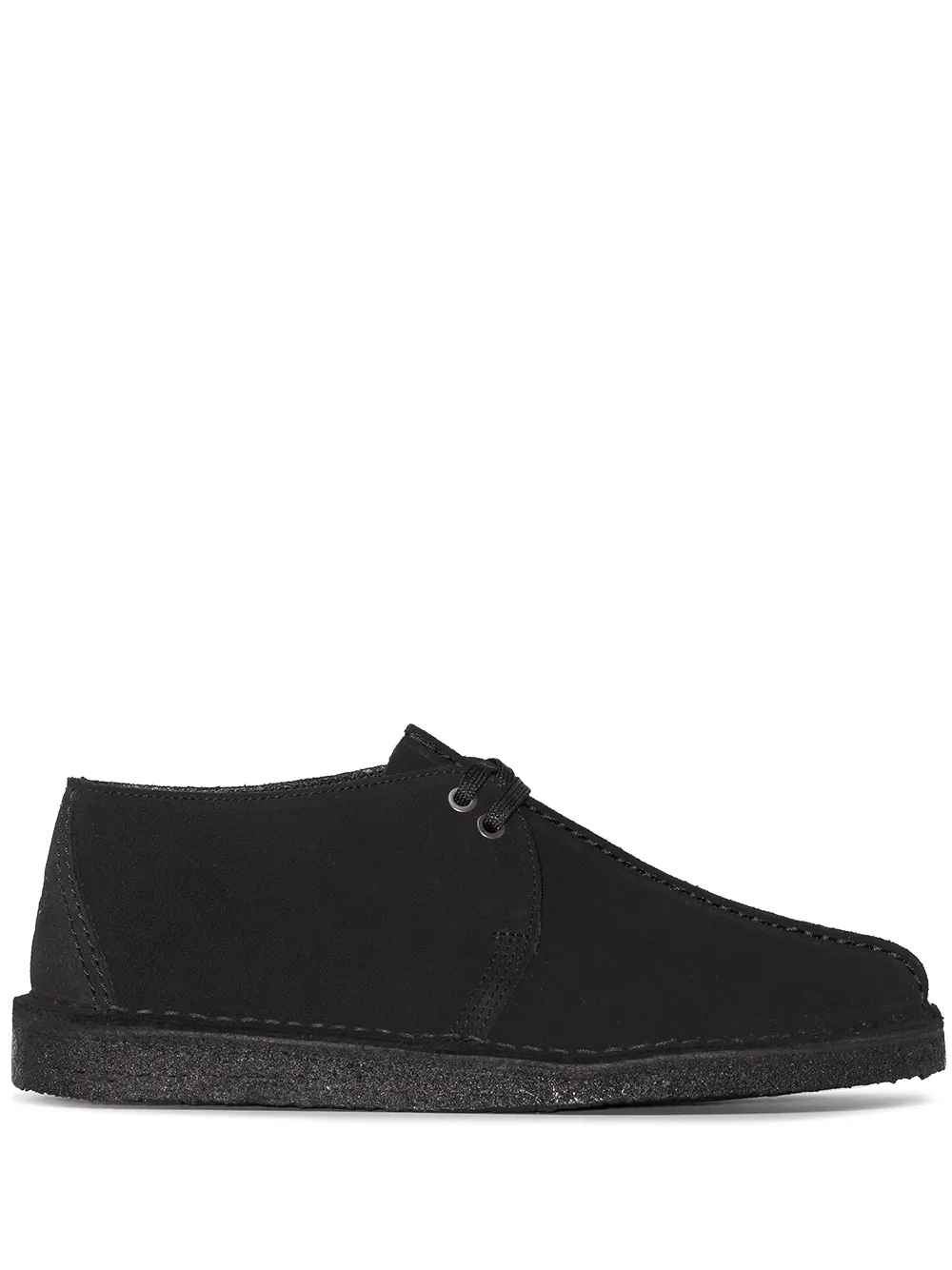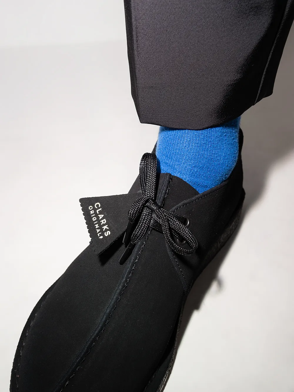First introduced in the ’70s, Clarks Originals’ Desert lace-ups are designed with a unique recognisable silhouette. This black suede iteration features a leather heel tag with the Trek man emblem, a signature of the brand.