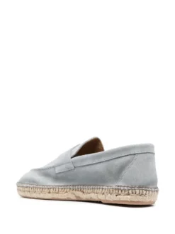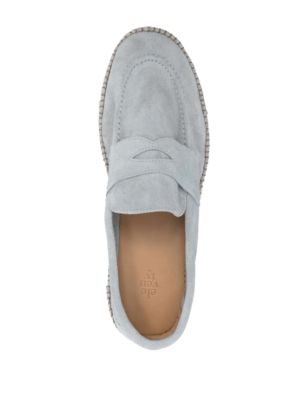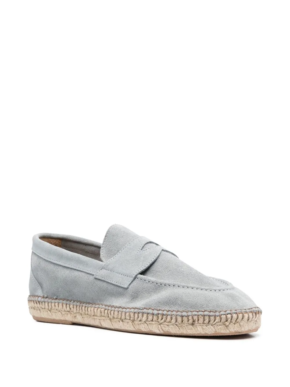 suede penny espadrilles from ELEVENTY featuring powder blue, calf suede, calf leather, tonal stitching, penny slot, branded leather insole, jute sole, round toe and slip-on style.