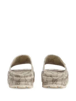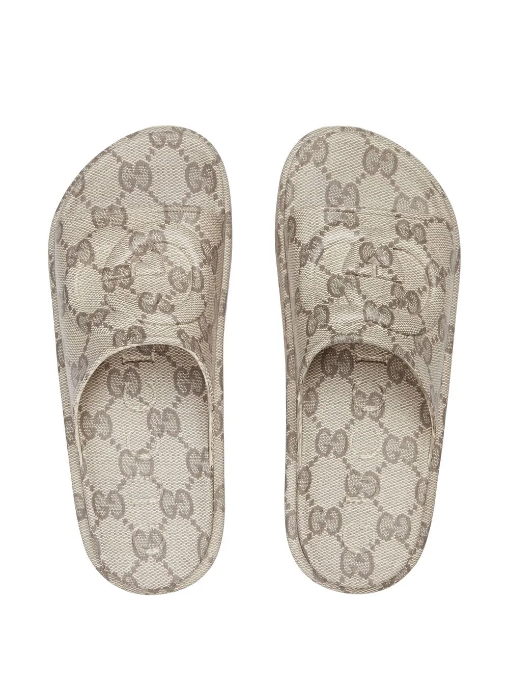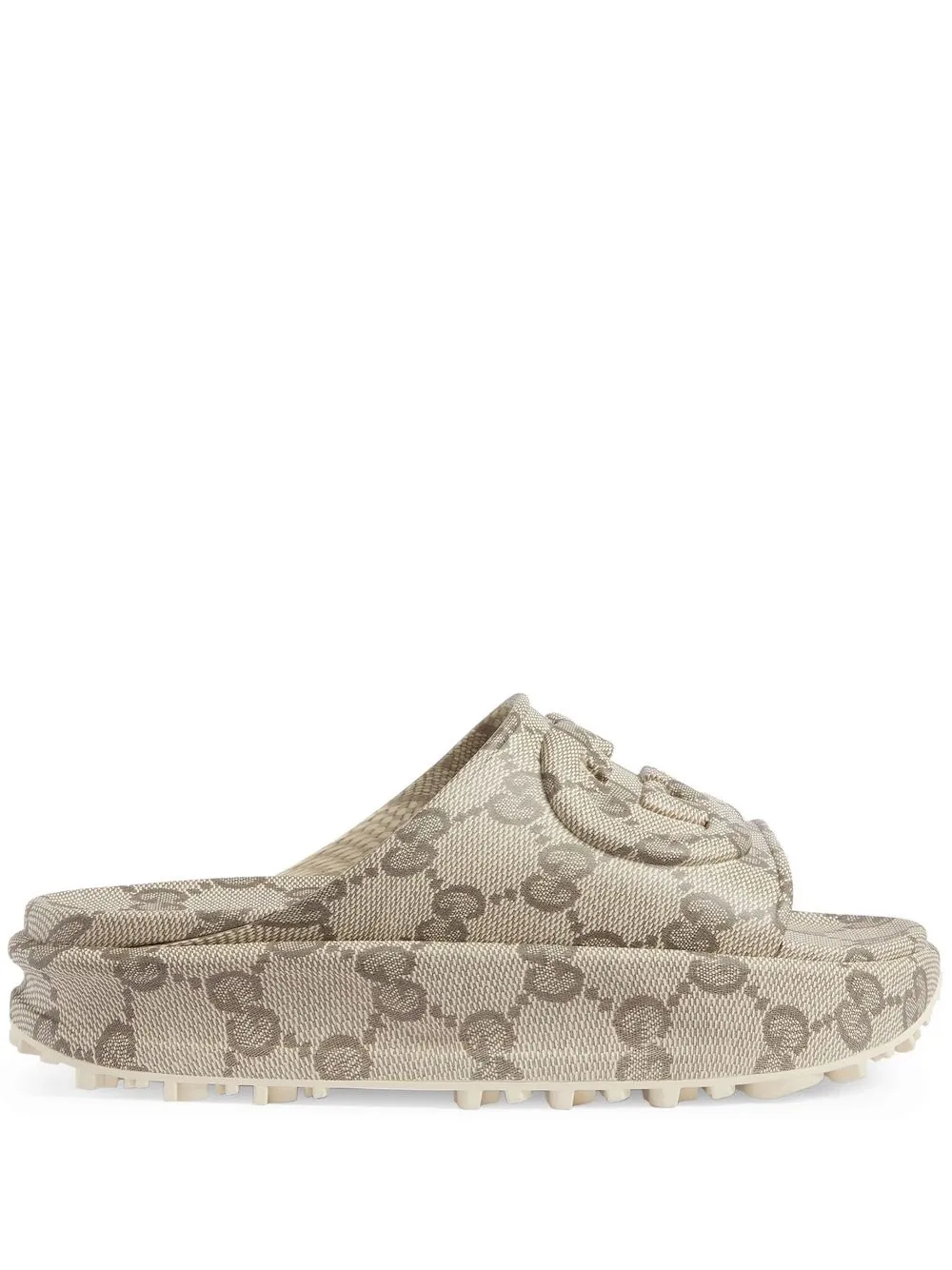 Interlocking G slide sandals from Gucci featuring beige, brown, signature GG Supreme print, embossed logo to the front, round toe, branded insole and platform sole.