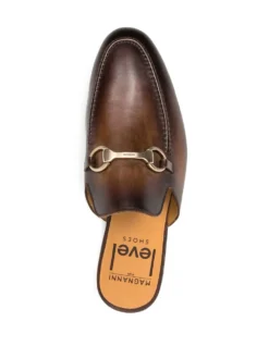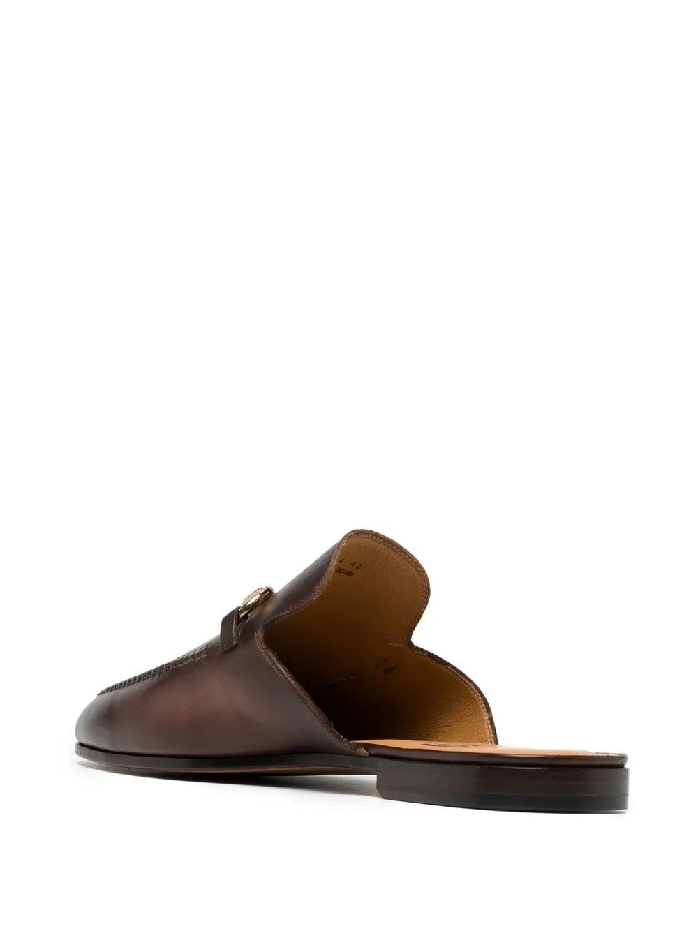 Dark brown leather horsebit-buckle slip-on loafers from MAGNANNI featuring almond toe, horsebit detail, slip-on style, branded footbed and stacked sole.