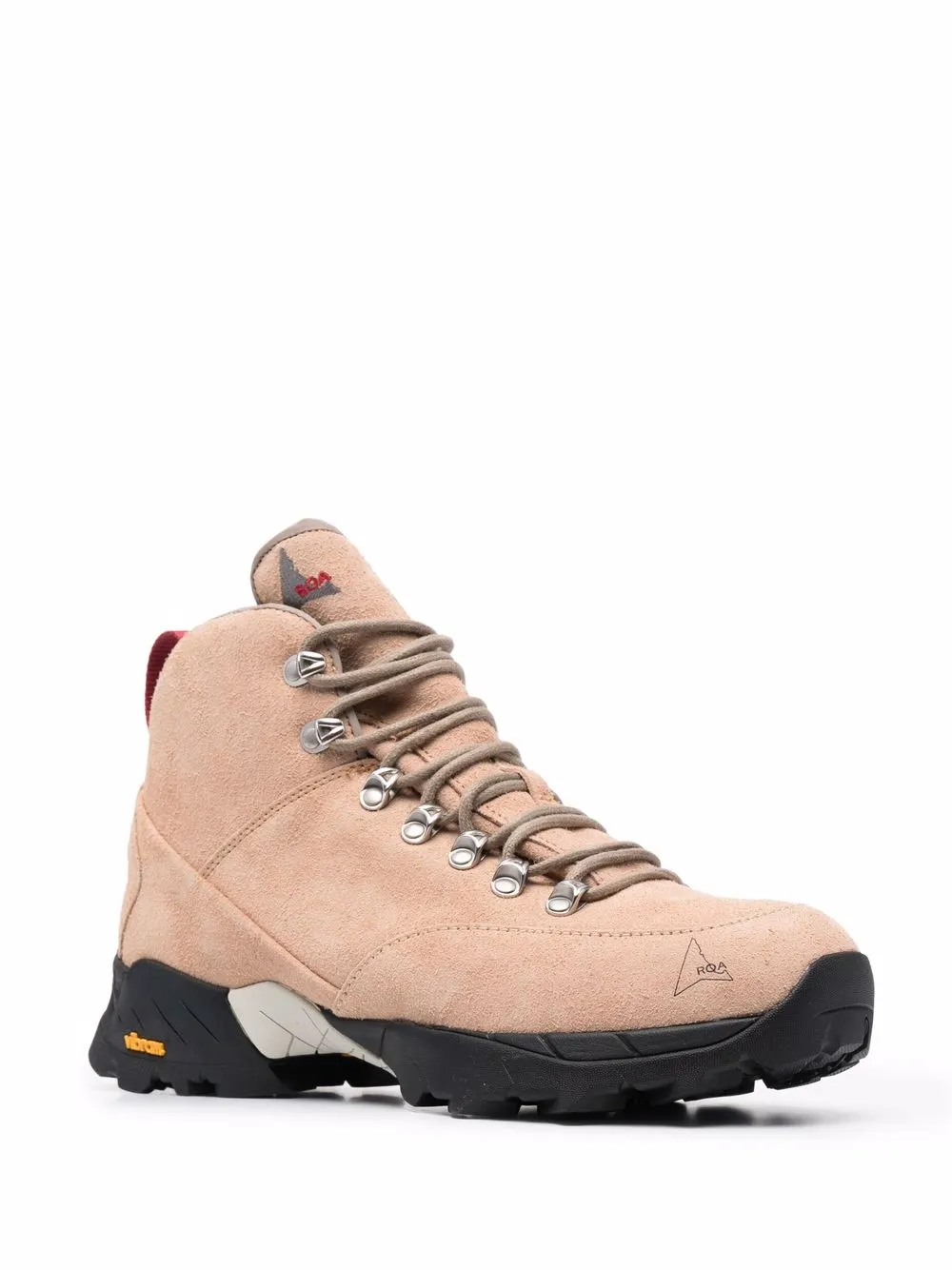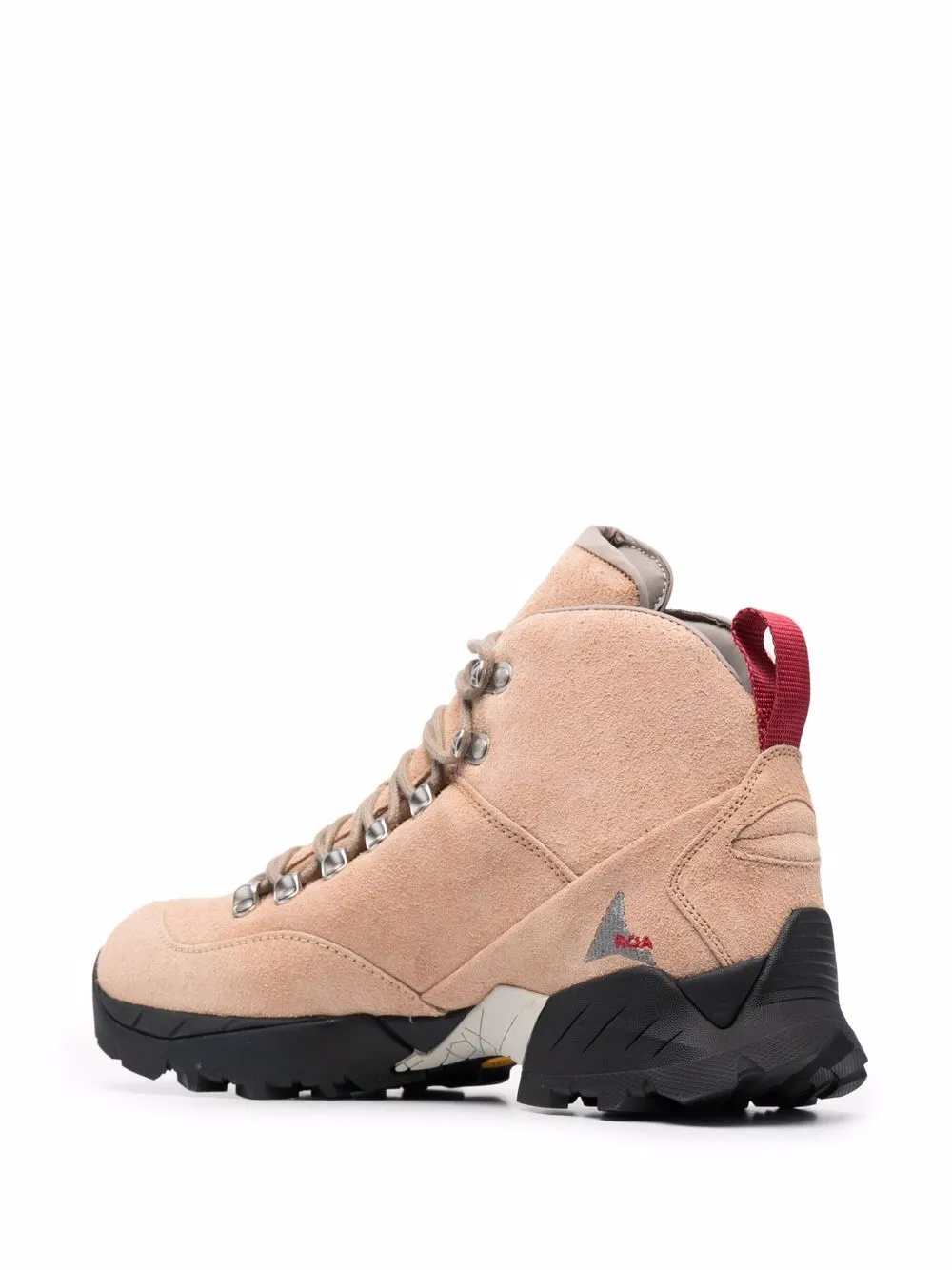 Beige suede Andreas suede hiking boots from ROA featuring logo patch at the tongue, round toe, front lace-up fastening, pull-tab at the heel and chunky rubber sole.