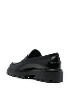 patent-leather loafers from TOD’S featuring black, calf leather, high-shine finish, chunky rubber sole, round toe and slip-on style.