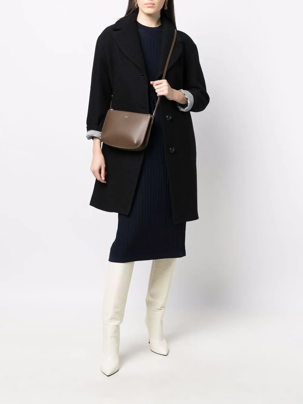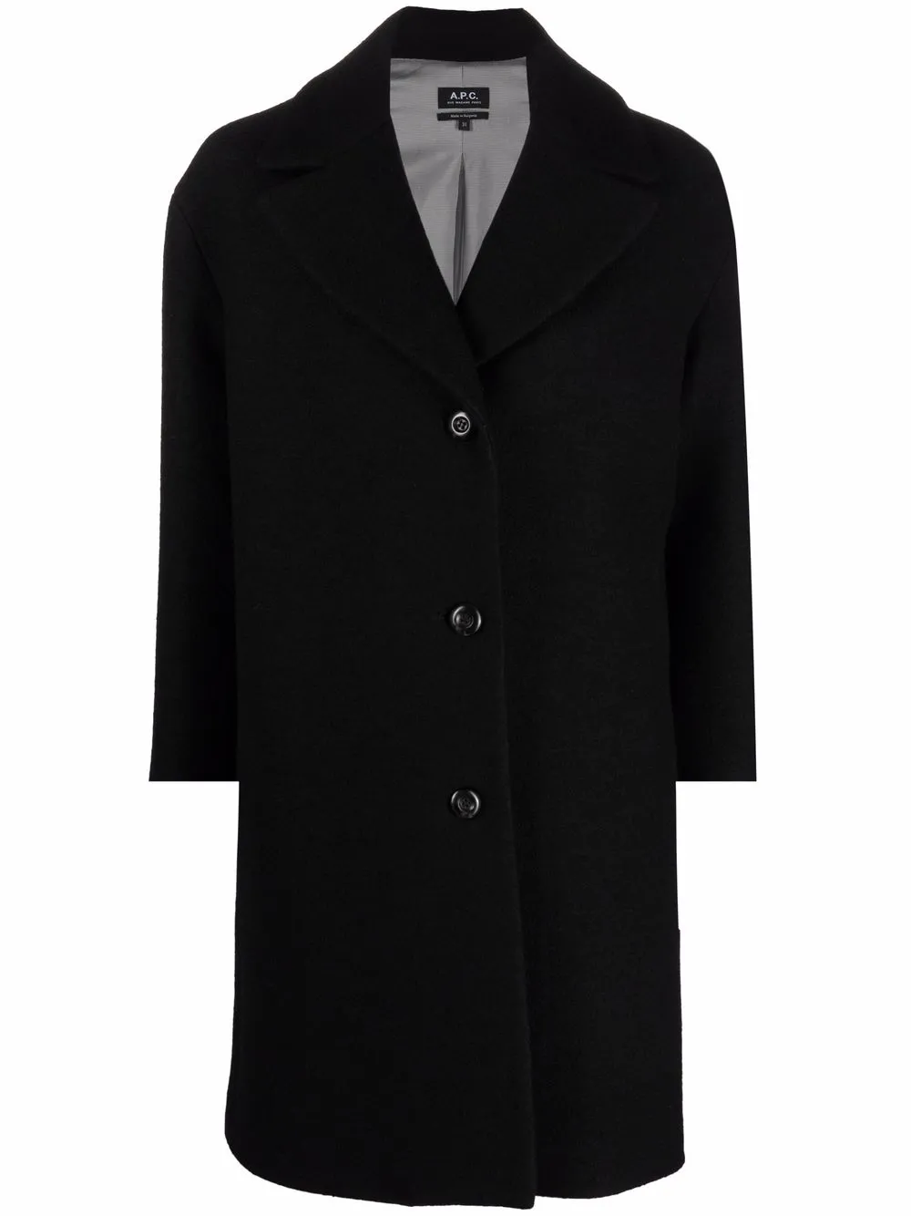 Black virgin wool wide-collar single-breasted coat from A.P.C. featuring knitted construction, wide notch lapels, front button fastening, long sleeves and full lining.