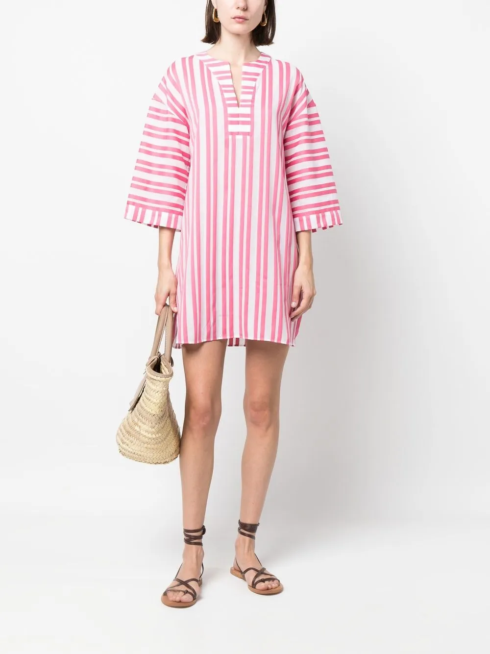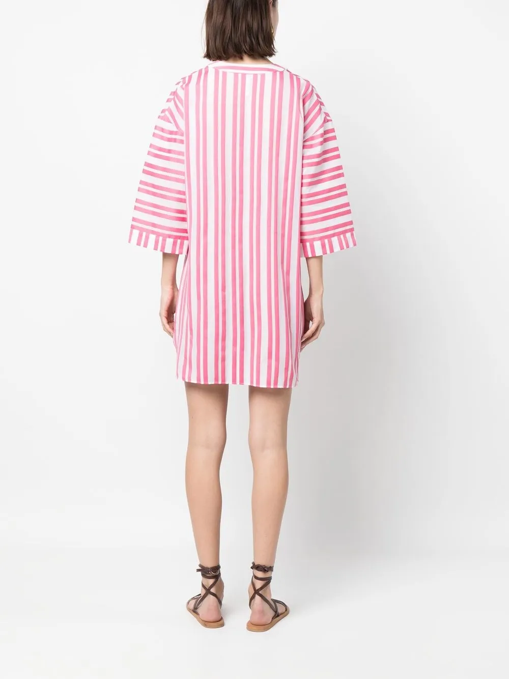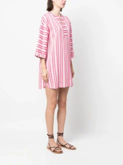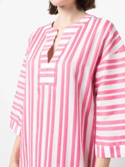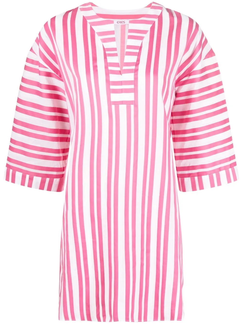 Made from crisp white cotton and punctuated by bold pink stripes throughout, the Amor dress seamlessly evokes Eres’ focus on resort wear and relaxed silhouettes.