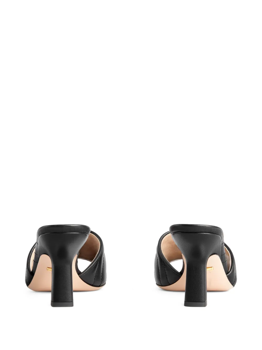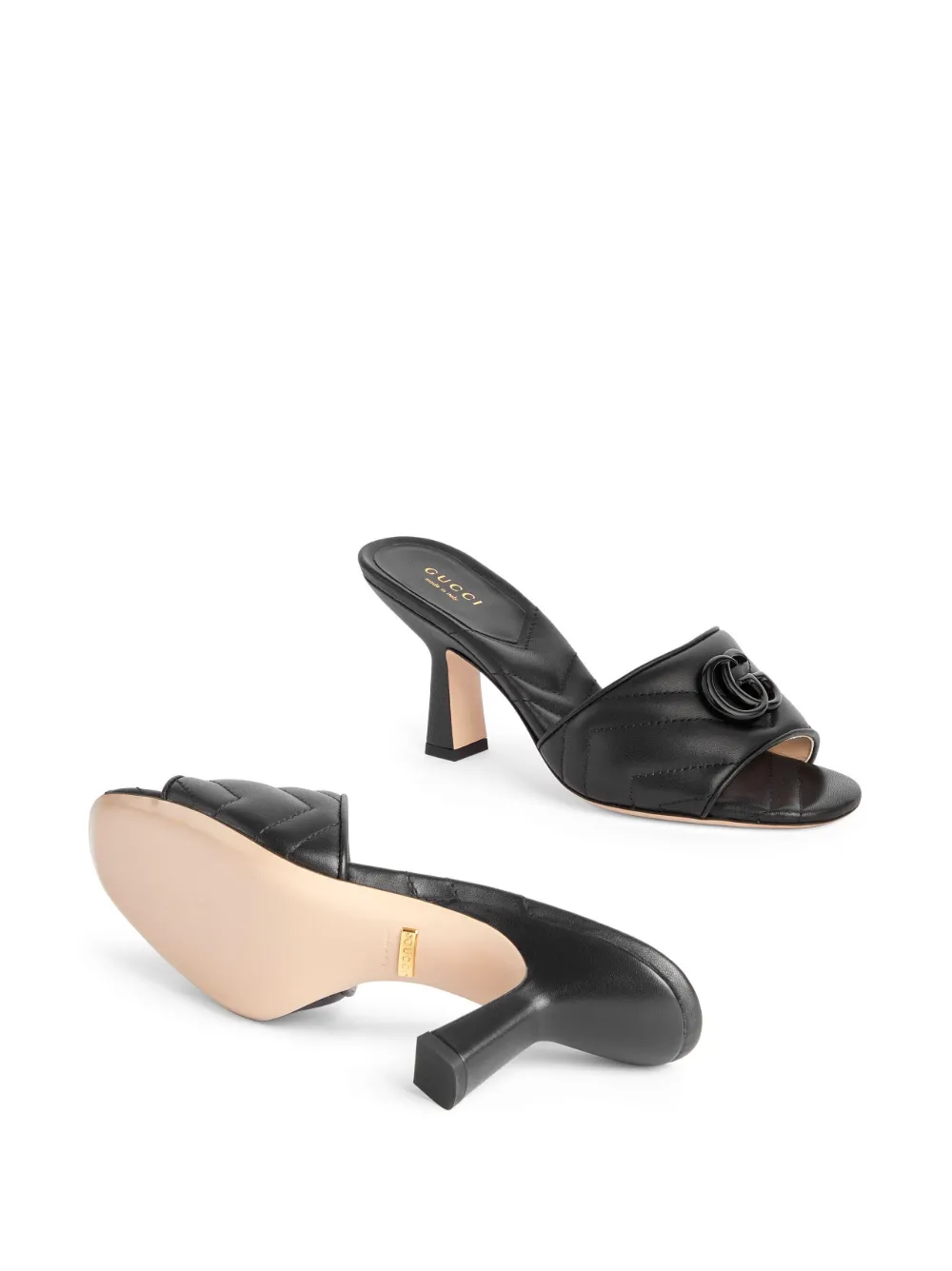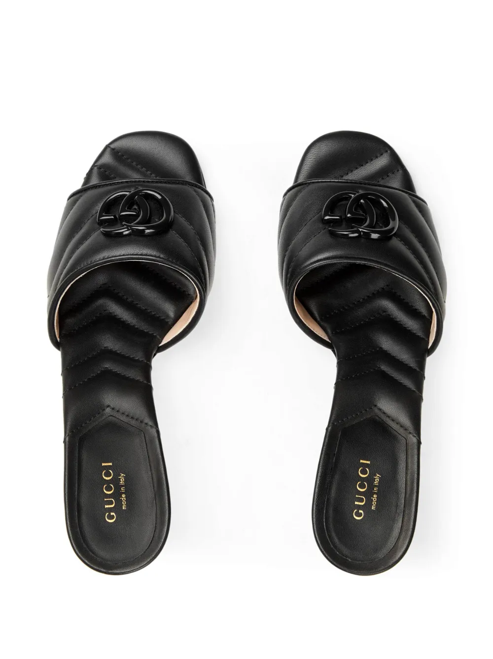 Double G 75mm slide sandal from Gucci featuring black, leather, chevron quilting, signature Double G logo, branded footbed, open toe, single toe strap and mid heel.