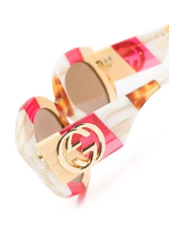 round-frame striped sunglasses from GUCCI EYEWEAR featuring ivory white, pink, brown, acetate, tortoiseshell effect, diagonal stripe pattern, signature Interlocking G logo, logo-engraved arm, round frame, brown tinted lenses, UV protection, curved tips and oversize arms. These glasses come with a protective case..