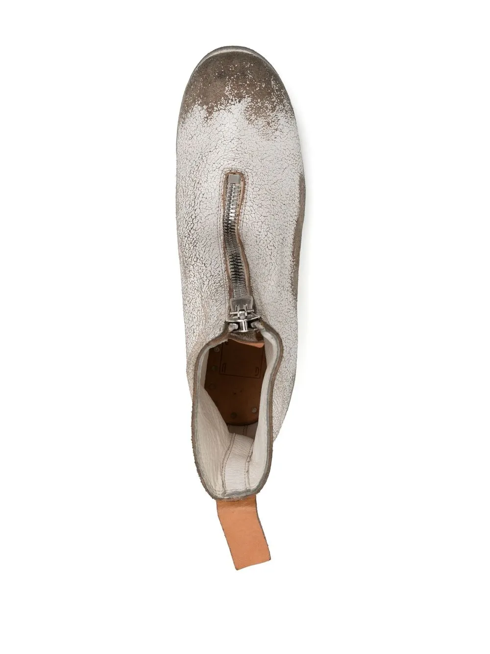 40mm zip-up ankle boots from GUIDI featuring off-white, distressed finish, almond toe, front zip fastening, pull-tab at the heel, branded leather insole, low block heel and leather.