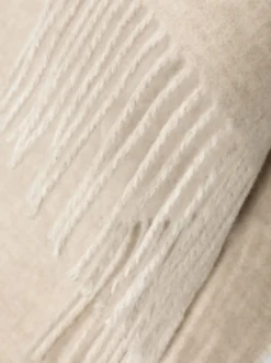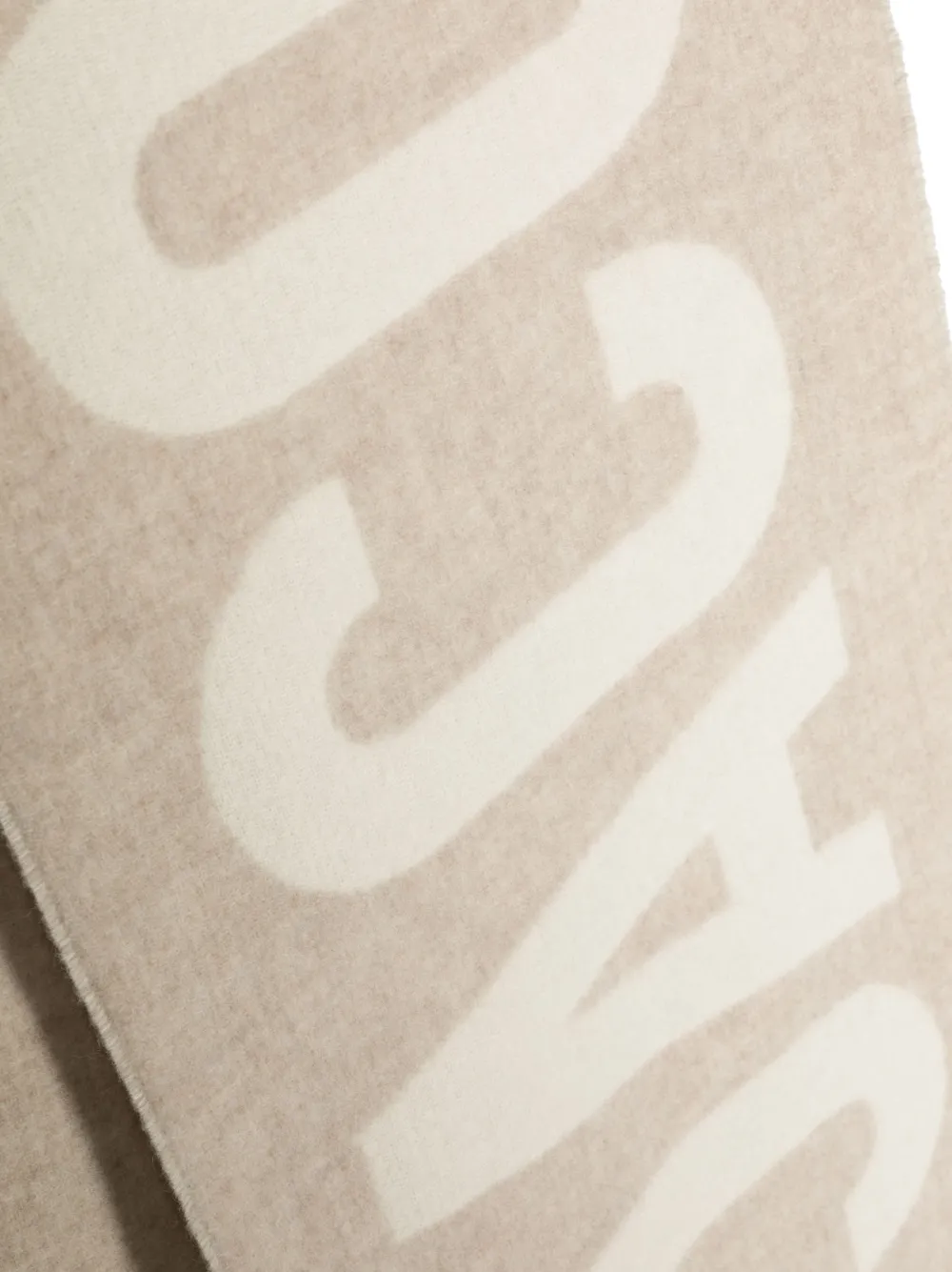 Crafted from virgin wool, this scarf is decorated with an intarsia-knit logo in a tonal beige hue and finished with a fringed edge.