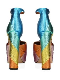 Set atop a high block heel, the Kensington pumps are instantly recognisable as Kurt Geiger London’s. The rainbow leather construction is finished with a striped effect and the almond toe is accented with the signature eagle head charm.