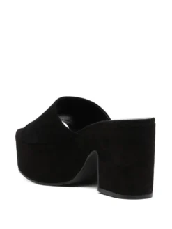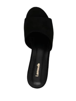 platform sole mules from Larroude featuring jet black, calf leather, open toe, crossover strap at the toe, branded insole, slip-on style, platform sole and mid block heel.