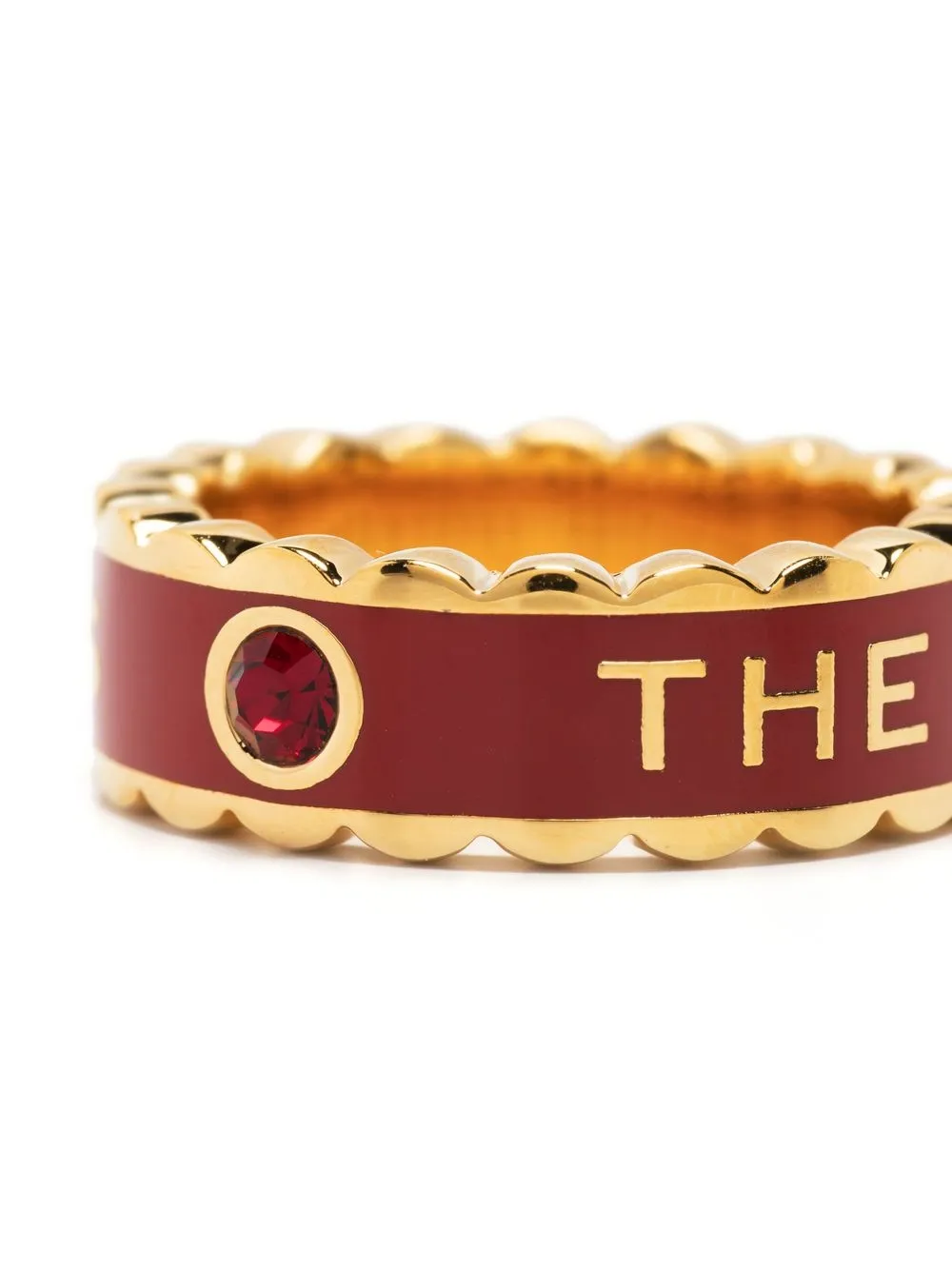 Marc Jacobs’ ring spotlights the brand’s moniker. Here, an embossed iteration decorates this chunky iteration framed with scallop edges. The gleaming gold-tone hardware pops against the fiery red resin.
