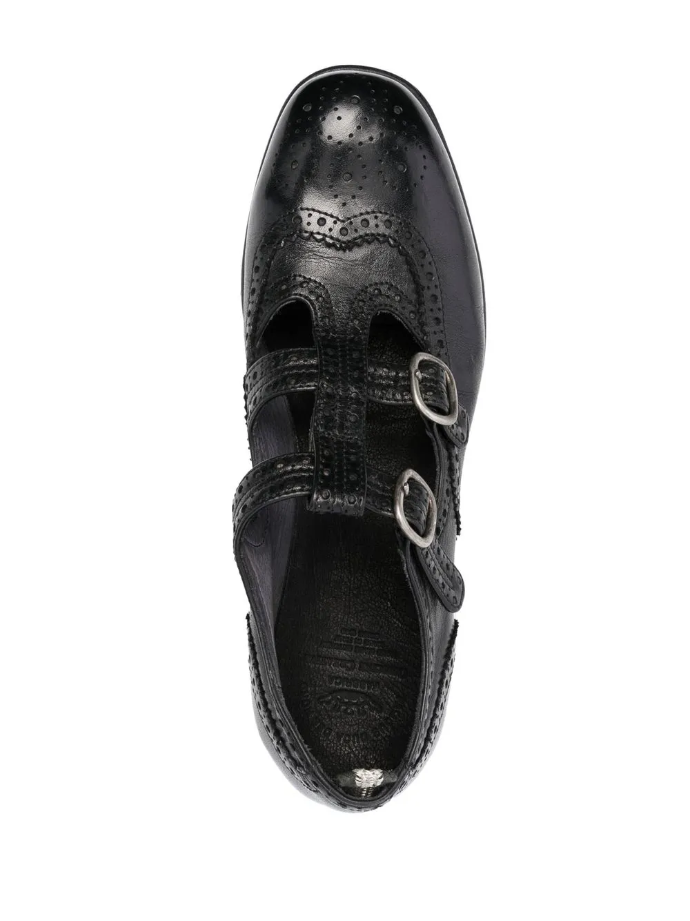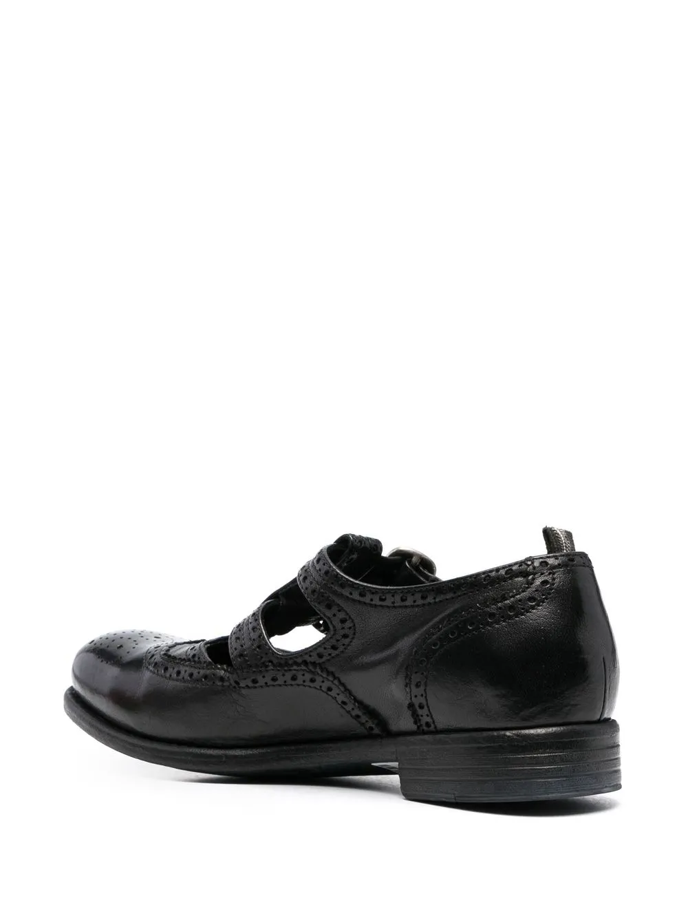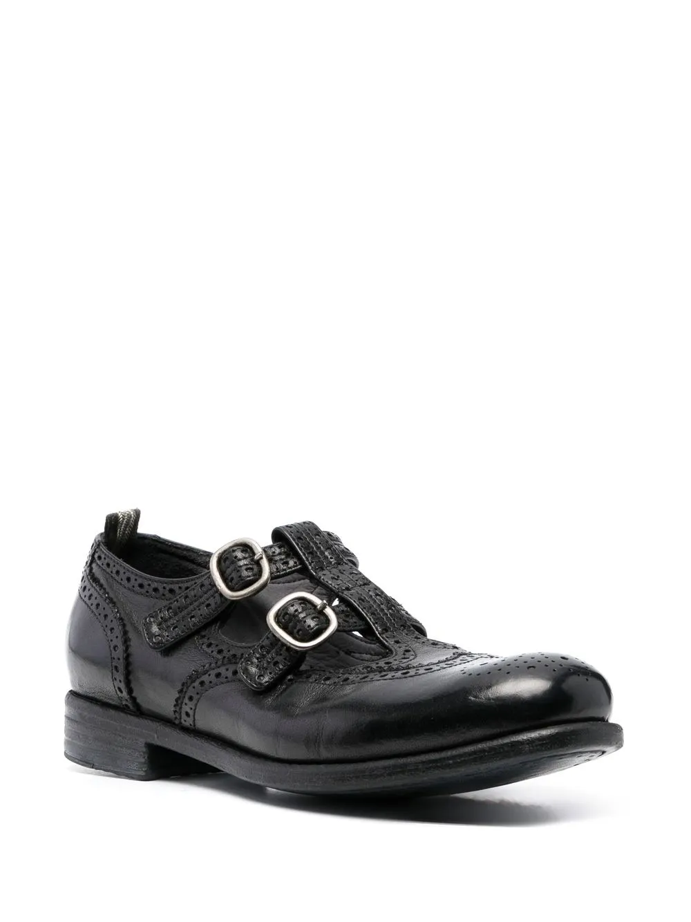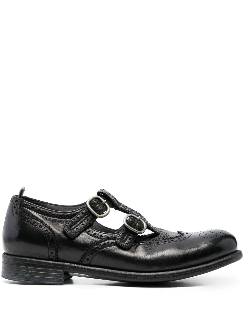 Calixte 046 wing-tip brogues from OFFICINE CREATIVE featuring black, calf leather, buffalo leather, silver-tone hardware, perforated embellishment, stripe trim, branded insole, pull-tab at the heel, round toe, buckle fastening and flat rubber sole.