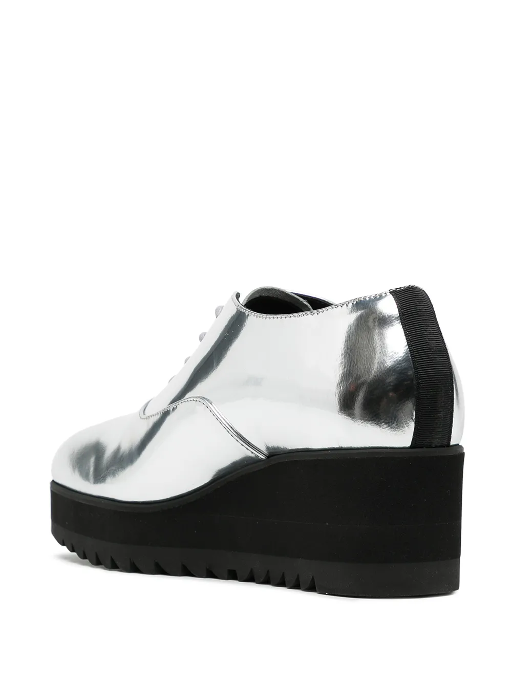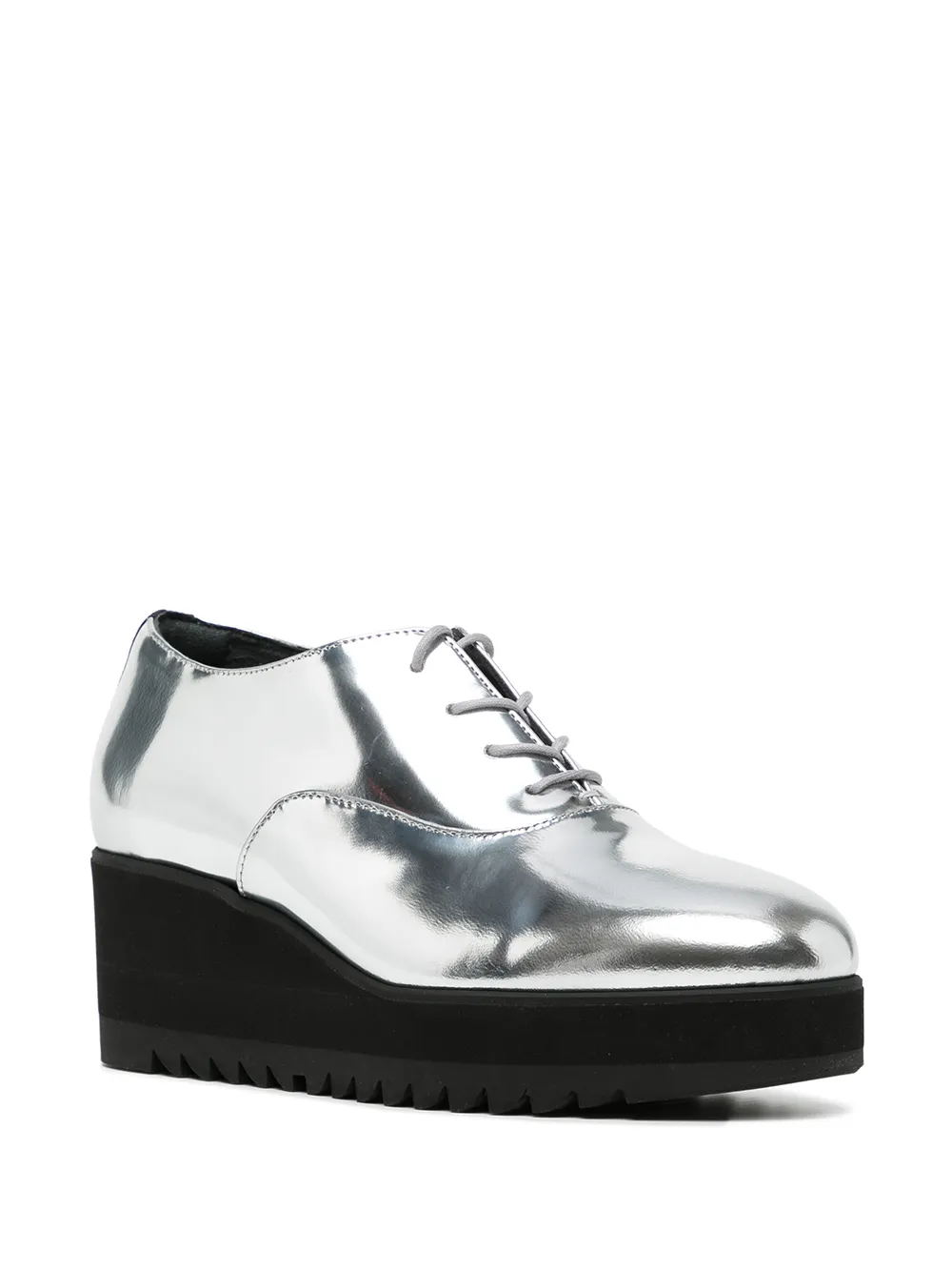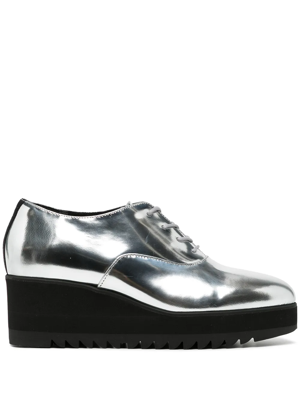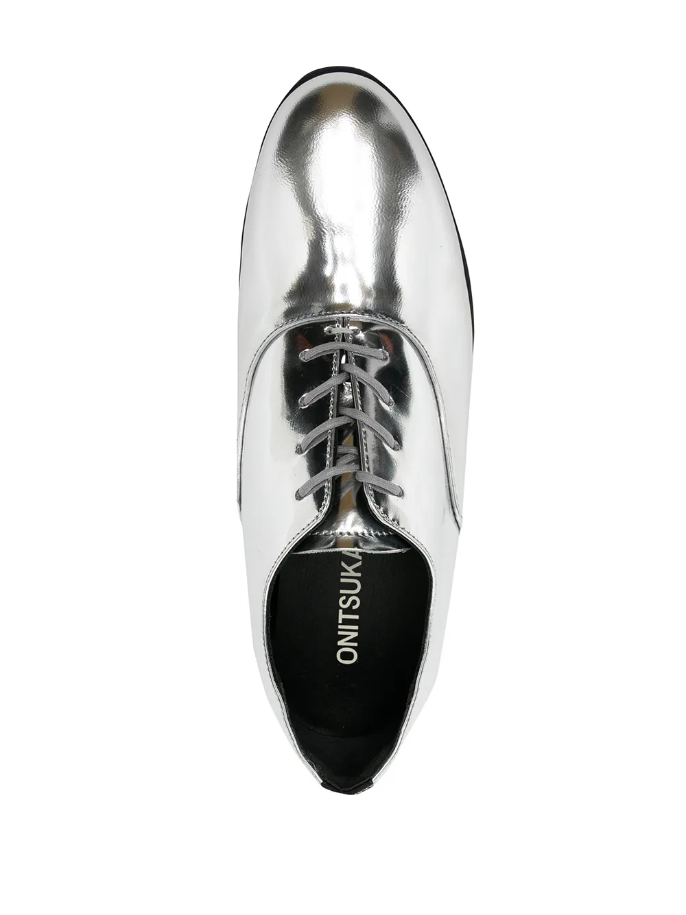 Silver leather Wedge-O lace-up shoes from Onitsuka Tiger featuring metallic effect, front lace-up fastening, round toe, wedge heel, flat rubber sole, branded insole, αGEL Foam cushioning and The Onitsuka collection.