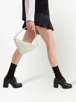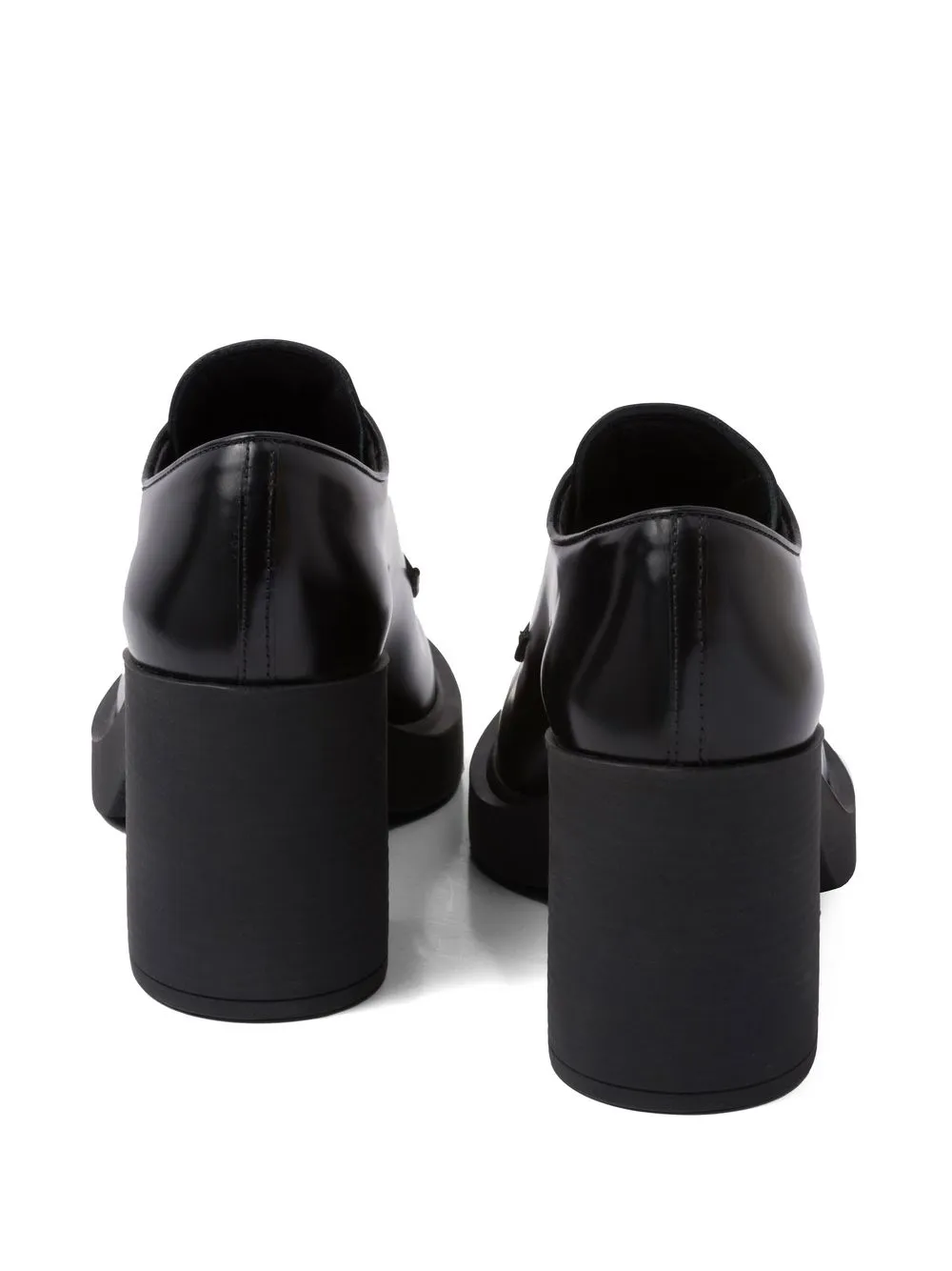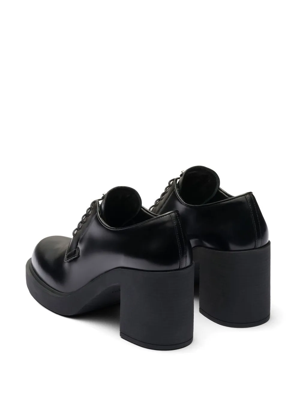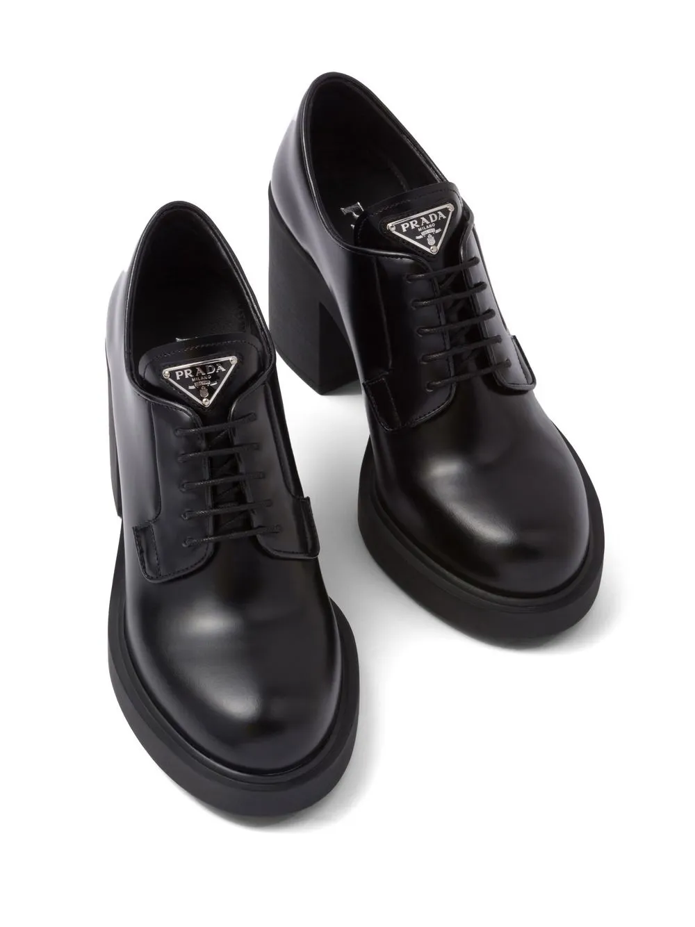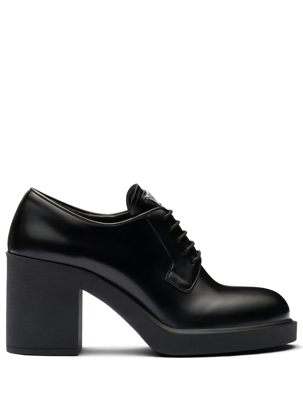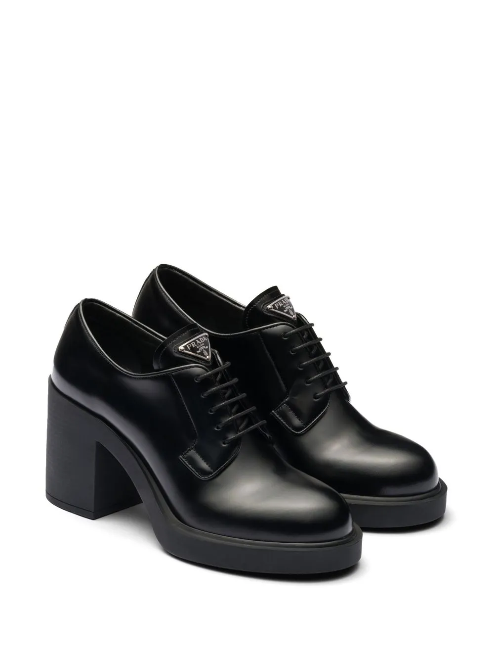 logo-plaque Brushed 85mm brogues from PRADA featuring black, leather, brushed effect, logo plaque, almond toe, front lace-up fastening, rubber sole and high block heel.