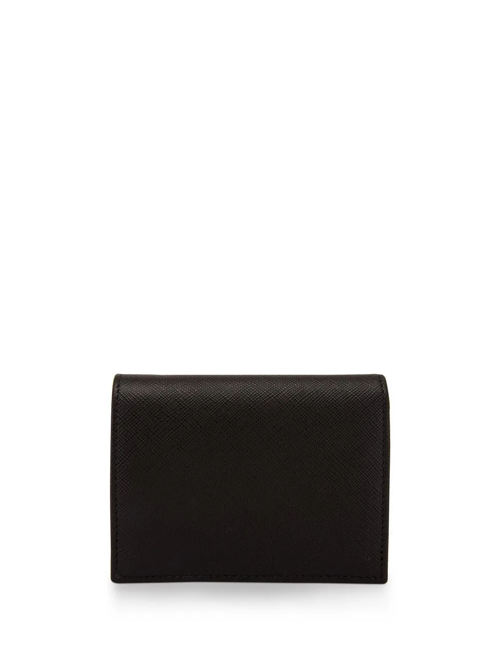 logo-plaque detail wallet from PRADA featuring foldover top with press-stud fastening, internal card slots, jet black, leather and gold-tone logo plaque.