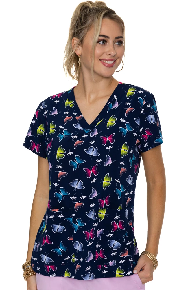 The Med Couture Originals Women’s Vicky Daisy Dance Print Scrub Top is cute, comfortable, and fully functional. Made with two front pockets for your needs, this stretchy scrub top compliments your favorite scrub pants.