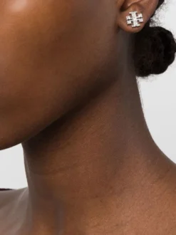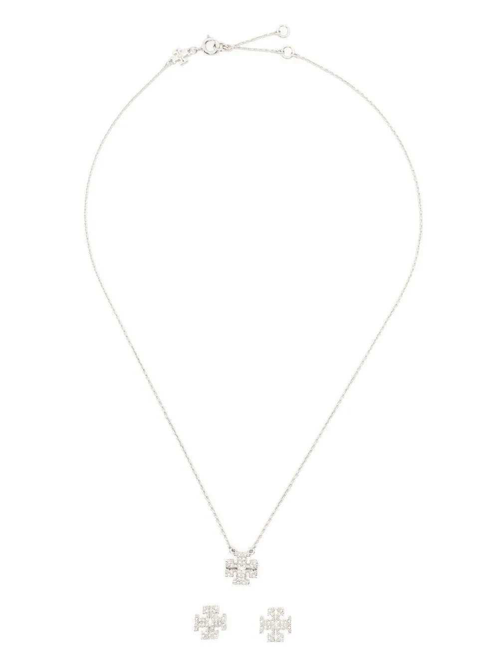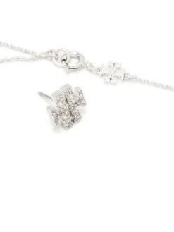 Kira Double-T necklace and earring set from TORY BURCH featuring silver-tone, plated finish, delicate chain, signature Double T motif, glass crystal embellishment, pavé setting, spring-ring fastening, adjustable fit, signature Double T motif, glass crystal embellishment, stud design, butterfly fastening and for pierced ears. These earrings come as a pair..