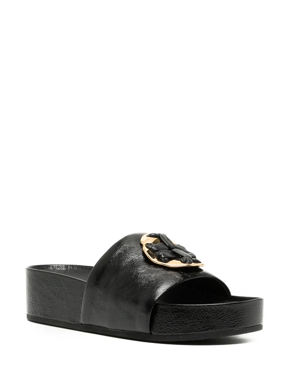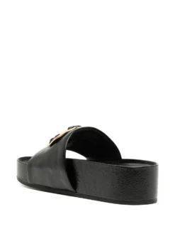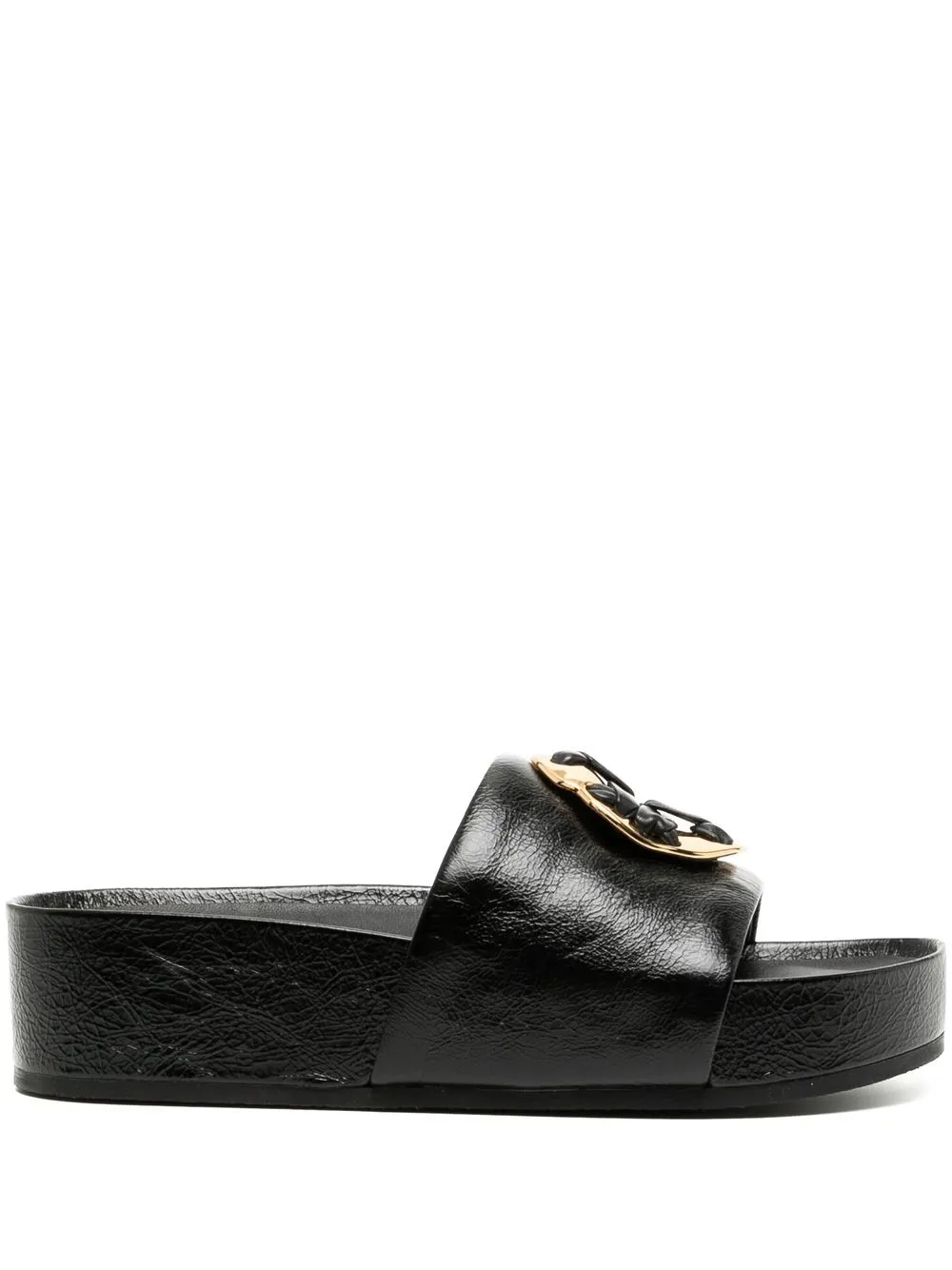 woven platform leather slides from TORY BURCH featuring black, leather, gold-tone hardware, slip-on style, round toe, rubber sole and Double T buckle.